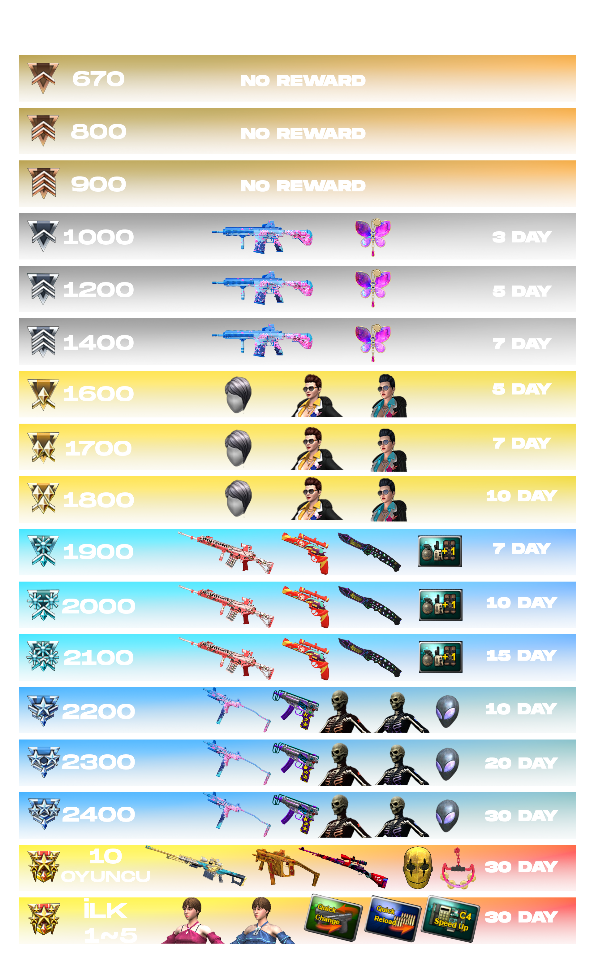 Shotguns, health-damaging smoke grenades, grenade launchers, APC9, Compound Bow, CrossBow, Barrett M82A1, Extra Grenade Pocket +1, wigs that grant both HP and Speed bonuses, instant-exploding grenades, and 140 HP characters.