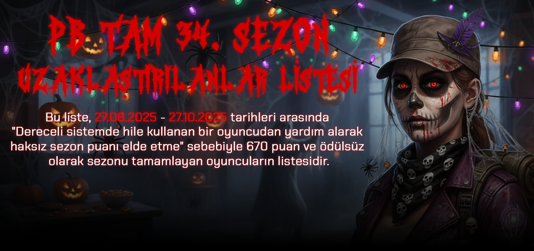 PB TAM 34. Sezon boyunca hile kullananları tespit etme çabalarından dolayı Moderatör arkadaşlarımıza ve siz değerli oyuncularımıza teşekkür ederiz.