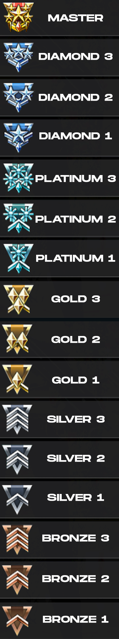 Bronze I, II, III – Silver I, II, III – Gold I, II, III – Platinum I, II, III – Diamond I, II, III – and finally Master.