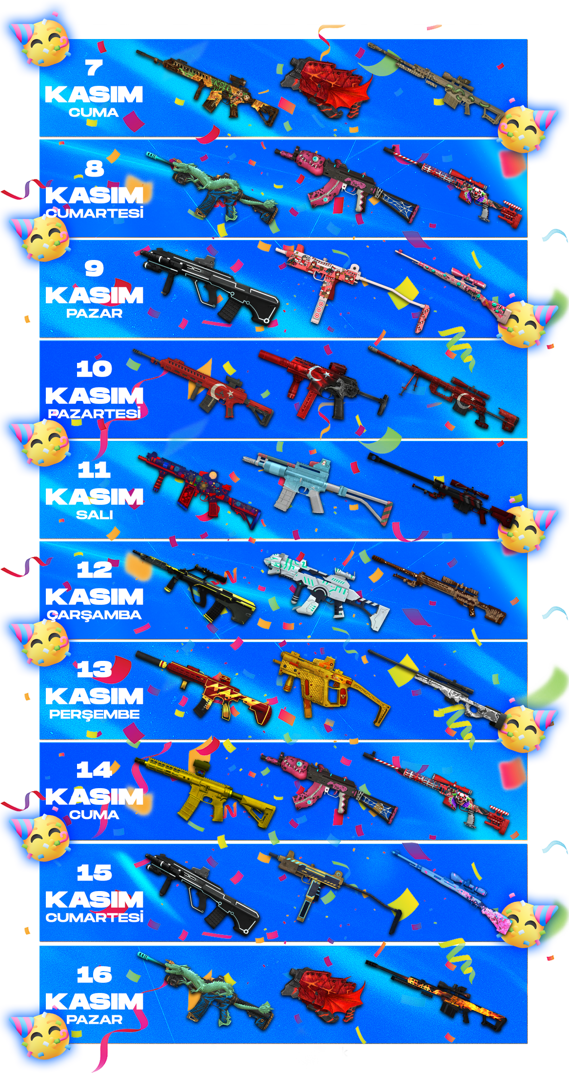 Belirtilen saatler arasında oyuna giriş yapan tüm oyuncularımız, her akşam 3 farklı popüler silahı anında kazanacak! Bu fırsatı kaçırmayın ve envanterinizi güçlendirin.