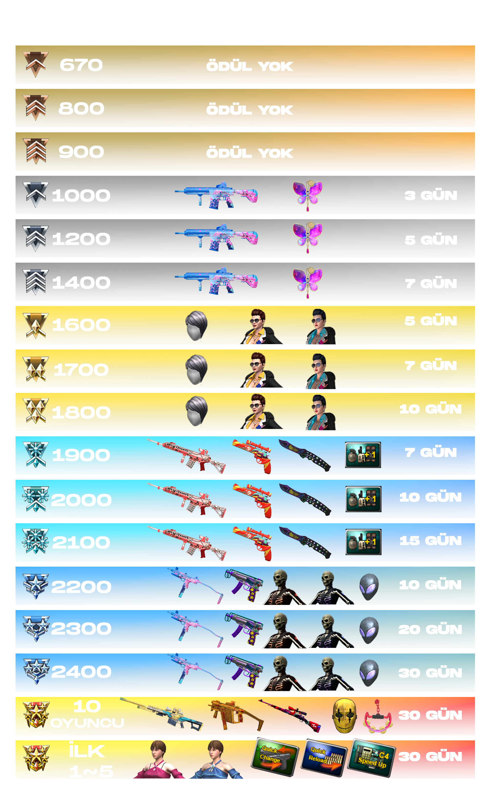 bomba atar silahlar, APC9, Compound Bow, CrossBow, Barrett M82A1, Xüsusi Bomba Cibi +1, can və sürət xarakterinə eyni vaxtda sahib pariklər,tez partlayan bombalar və 140 canlı personajlar istifadə edilməyəcək.