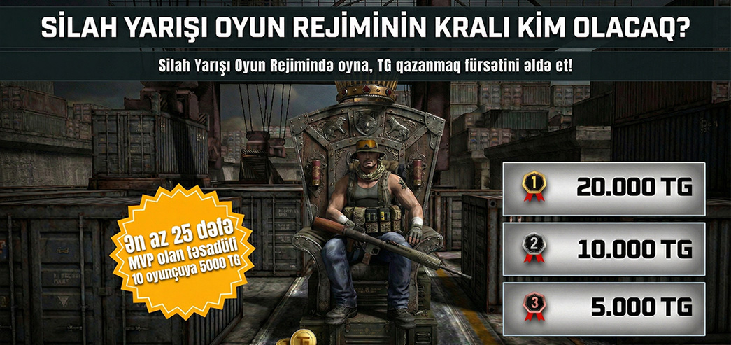 Həftəlik TG hədiyyələrimiz başladı! Oyun meydanında təcrübələrini danışdırıb komandanı daşıyan ən yaxşı oyunçularımızı möhtəşəm mükafatlar gözləyir.Silah Yarışı Rejimində bacarıqlarınızı nümayiş etdirin,ən çox MVP olan ilk 3 oyunçudan biri ol və ya şanslı mükafat hovuzuna girməyə haqq qazan!