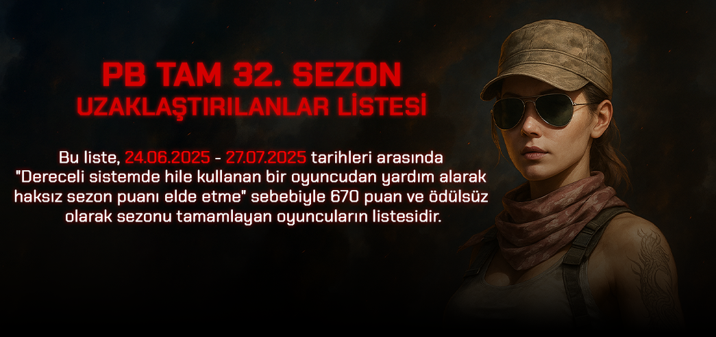 PBTAM 32. Sezon boyunca hile kullananları tespit etme çabalarından dolayı Moderatör arkadaşlarımıza ve siz değerli oyuncularımıza teşekkür ederiz.