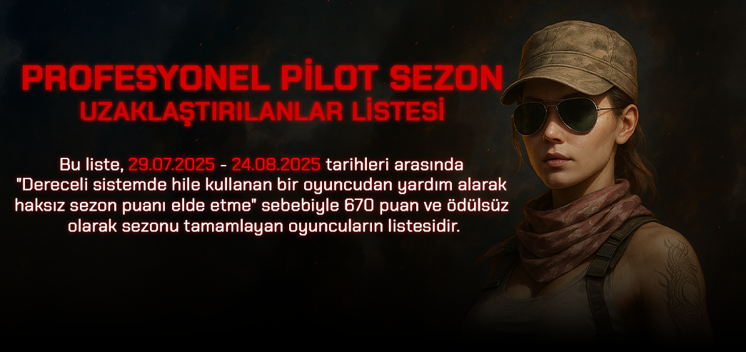Profesyonel Pilot Sezon boyunca hile kullananları tespit etme çabalarından dolayı Moderatör arkadaşlarımıza ve siz değerli oyuncularımıza teşekkür ederiz.