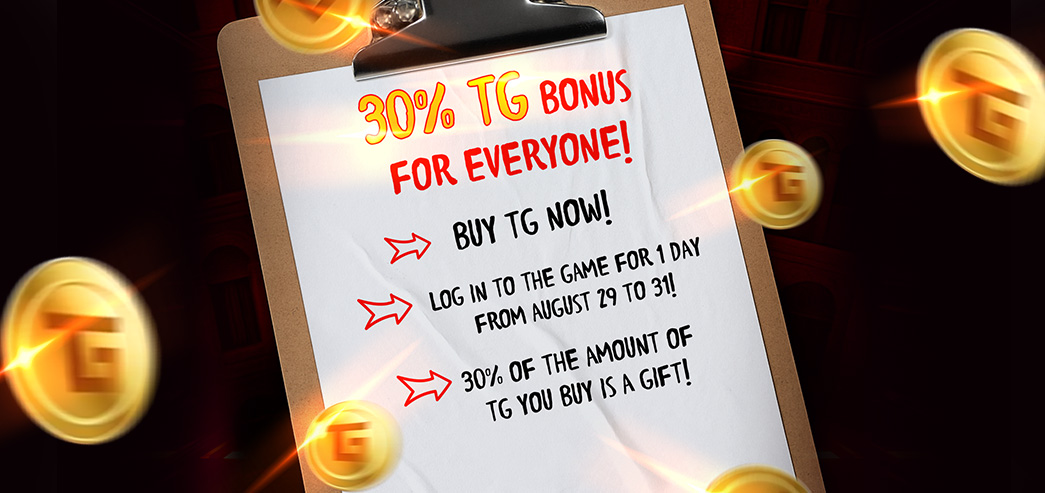A 30% BONUS awaits you on your first TG deposit between August 29th and 31st!